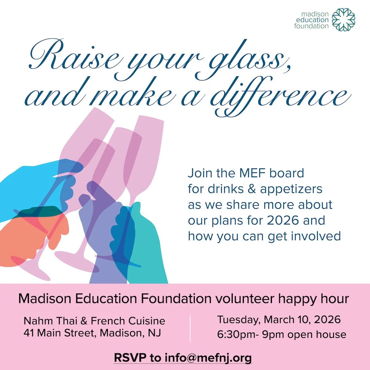 Interested in getting involved? Please join us for our Volunteer Happy Hour at Nahm Thai & French Cuisine on Tuesday, March 10, 2026 from 6:30 to 9 PM. RSVP to info@mefnj.org. We hope to see you there!